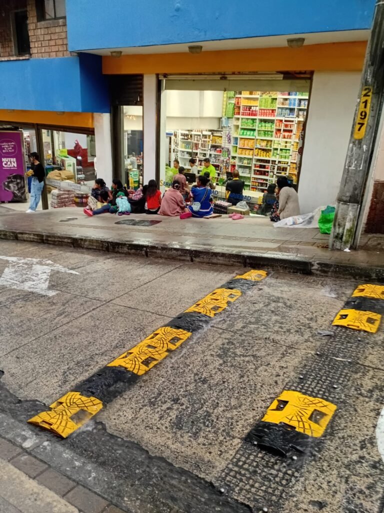 De paso en paso llego a la esquina de Gilberto Orozco, abarrote atestado de comparadores; el cielo seguía desfondado. En el suelo del andén mojado, miraban, agrupados, apelmazados en el límite divisorio de la vitrina, viendo la dinámica versada y hábil de los vendedores… Mojada la diáspora errante de mujeres indígenas y sus niños pedigüeños.