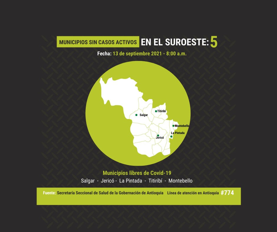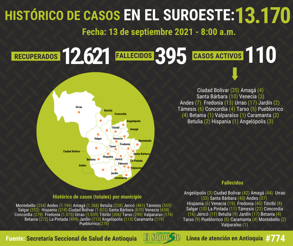 El Suroeste se sitúa como la cuarta región más afectada por el virus, con 13.170 casos acumulados, 395 fallecidos y 110 casos activos. A la fecha, Salgar, La Pintada, Jericó, Titiribí y Montebello son los cinco municipios del Suroeste sin casos activos.