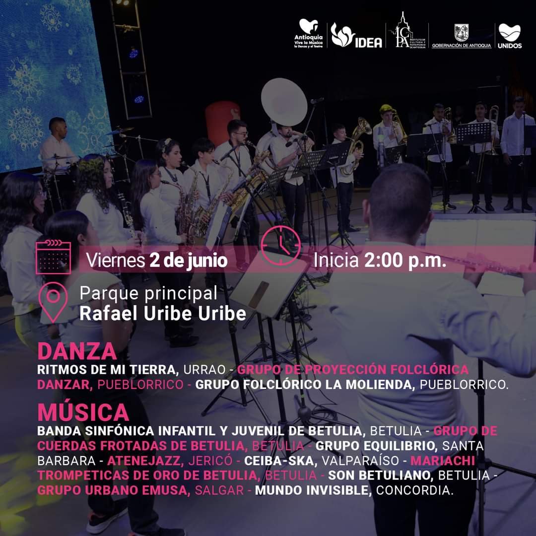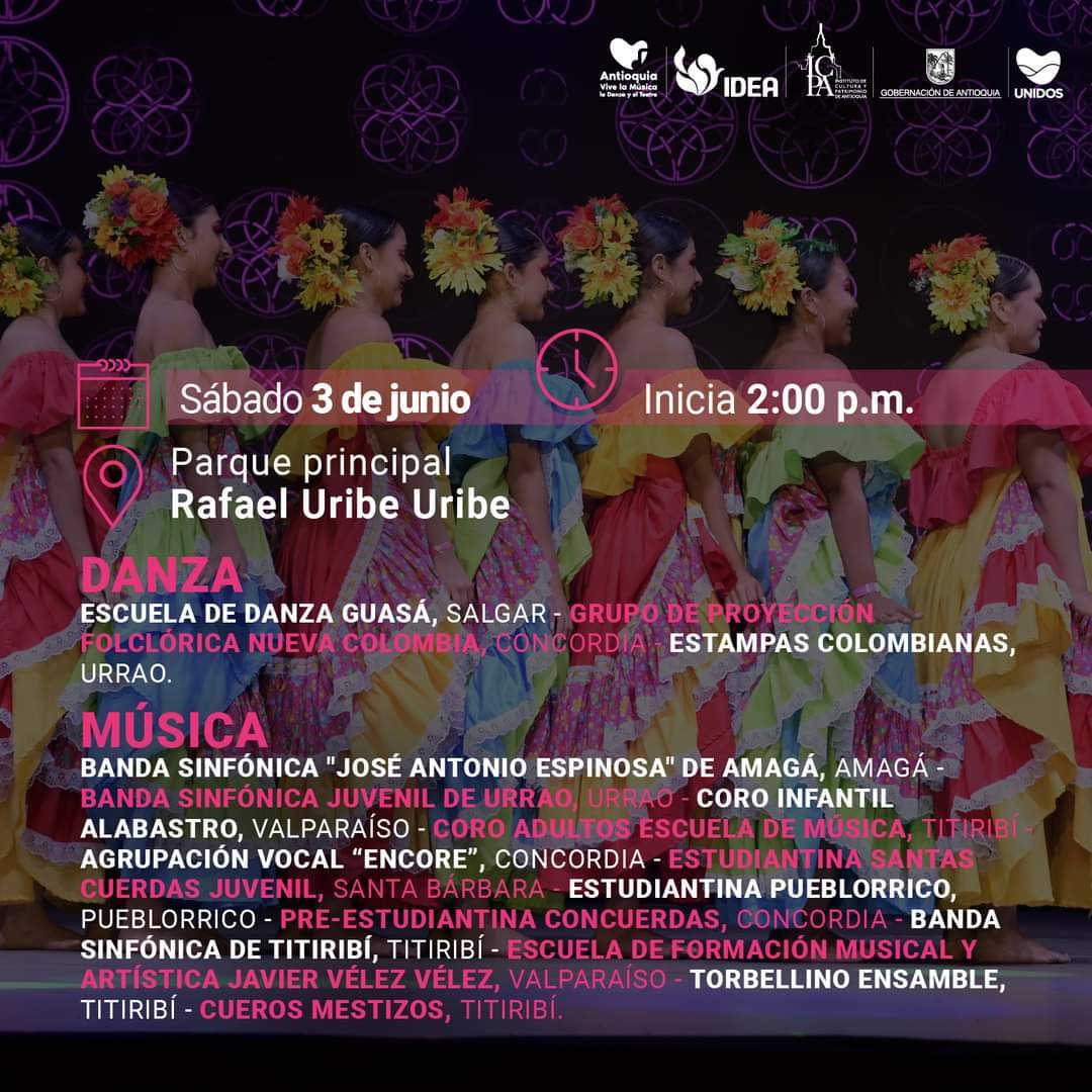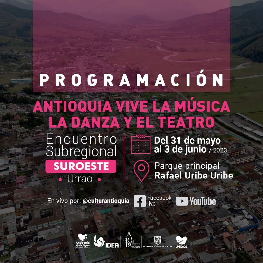 Del 31 de mayo al 03 de junio se realizará en el municipio de Urrao, Suroeste antioqueño el encuentro subregional de Antioquia vive la Música, la Danza y el Teatro. Este evento, contará con la participación de diferentes grupos artísticos de los municipios del Suroeste y tendrá como escenario principal el parque Rafael Uribe Uribe.