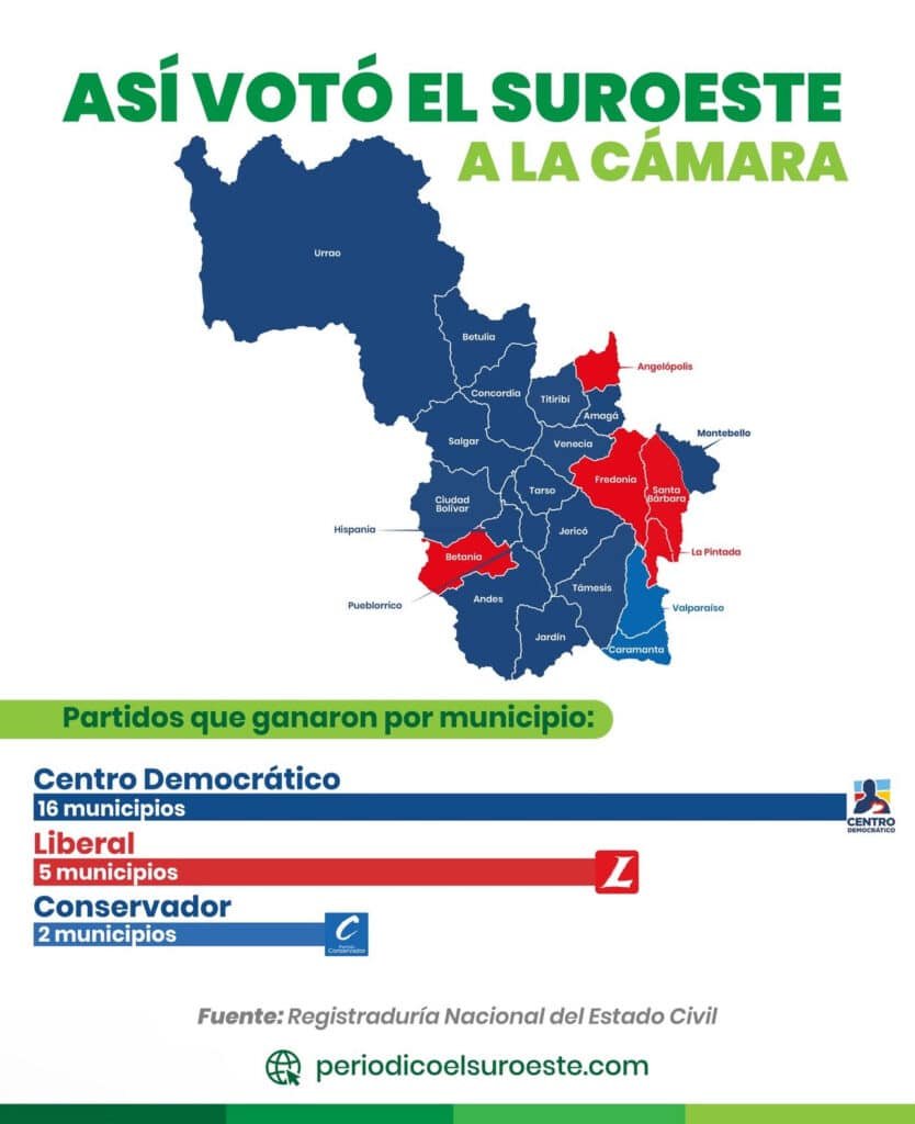 En la elección a la Cámara de Representantes, el Suroeste antioqueño reafirmó el predominio del Centro Democrático, que fue el partido con mayor votación en 16 de los 23 municipios de la región. El Partido Liberal Colombiano obtuvo la mayor votación en Angelópolis, Betania, Fredonia, La Pintada y Santa Bárbara; mientras que el Partido Conservador Colombiano se impuso en Caramanta y Valparaíso. A diferencia del Senado, en esta elección desapareció el liderazgo territorial del Partido de La U en el municipio de Andes. Aunque el Pacto Histórico tampoco encabezó la votación en municipios del Suroeste, sí mantuvo presencia como segunda fuerza en Amagá, Ciudad Bolívar y Jericó, mientras Creemos logró destacarse en Jardín como segunda votación.