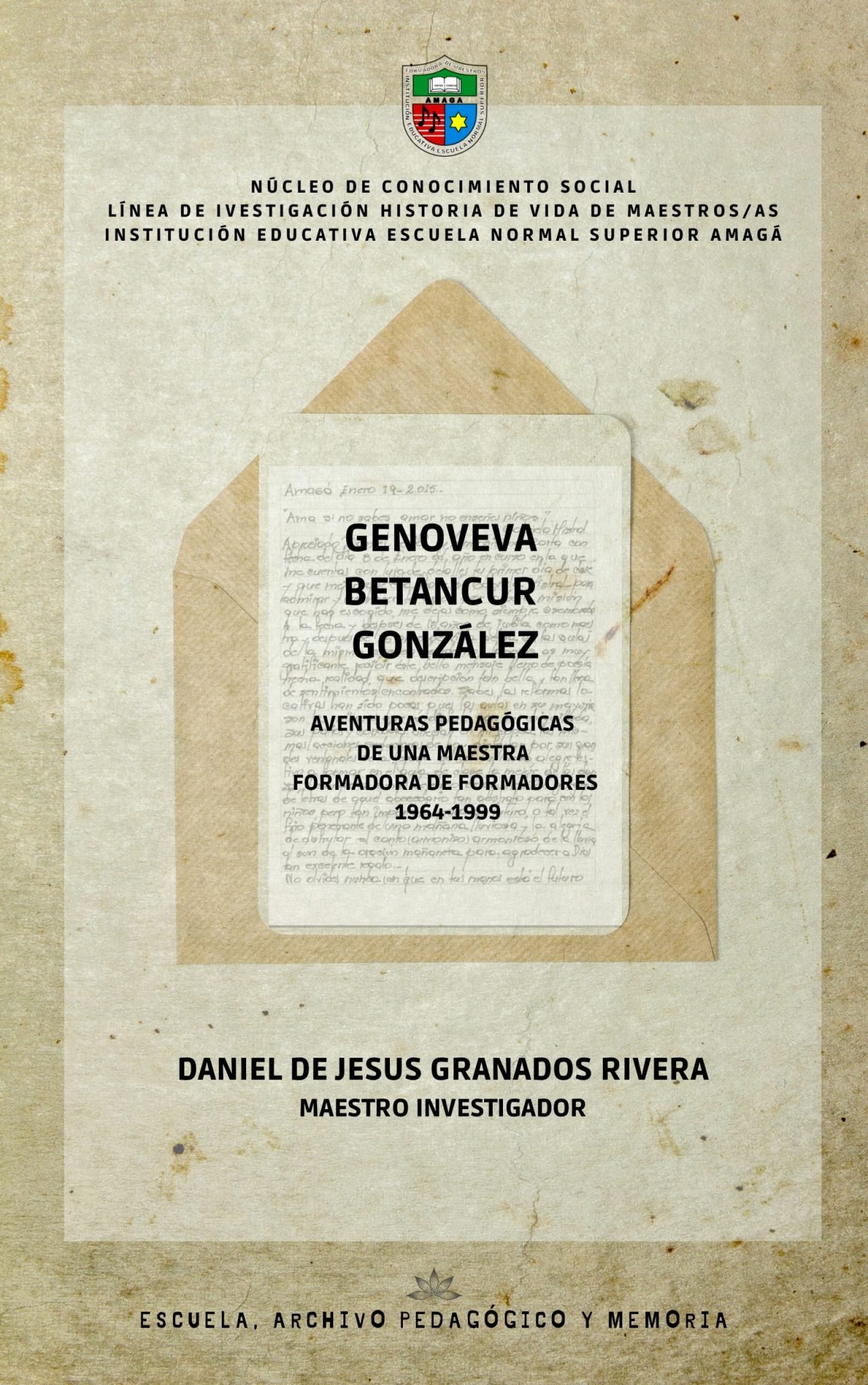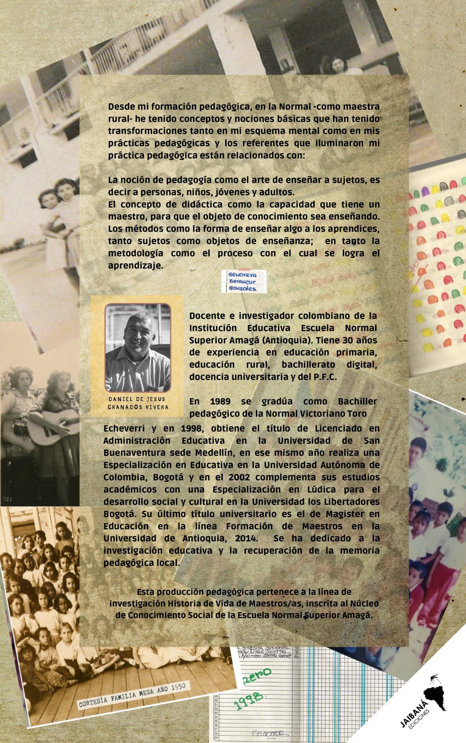-La idea de este texto pedagógico surge en la línea de investigación de archivo pedagógico del núcleo de conocimiento social. De ahí se da las narrativas pedagógicas o historia de maestros como una estrategia de visibilizar la vida y obra de los maestros. La Normal había iniciado en el 1998 trabajando historias de vida y narrativas pedagógicas, entonces yo quise retomar contado la vida Genoveva Betancur González, ya que fue una formadora de formadores en la escuela María Auxiliadora sede de la Escuela Normal Superior Amagá.