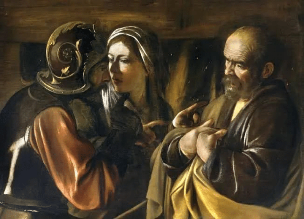 Las negaciones de Pedro, por Caravaggio nos muestran un realismo del evangelio, el claro oscuro del lienzo es la carne en situación, el miedo lo invade y sus manos son llevadas hacia su pecho, comprendiendo que su acción desgarra su corazón, al negar a quien tanto ha amado, y acompañado su camino, la obra del artista nos hace preguntarnos humanamente, recordando la primera emoción que integra la catarsis aristotélica ¿Quién en lugar del apóstol no habría hecho lo mismo?