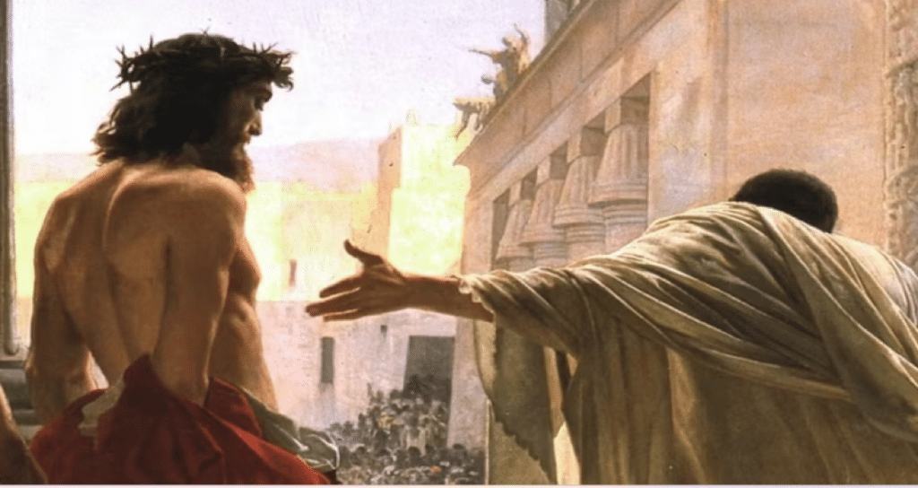 La pintura de Antonio Ciseri, el Ecce Homo, he ahí al hombre, presenta luego de poner a elección a Jesús o Barrabás, en lo que pareciera una acción democrática a simple vista, en la cual la multitud elegiría a quién concederle la libertad se convierte en un momento sublime visto del siguiente modo:
