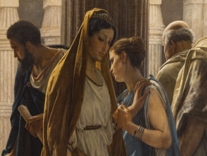 La mujer abandona la escena con expresión de dolor, con la mirada baja, observando de reojo al espectador que contempla el cuadro. Aunque la obra de Antonio Ciseri, integra estos elementos, la muestra análoga en la puesta de esta escena por parte de los Tribunales de Semana Santa, agudiza la profundidad de la caracterización, como se alcanza apreciar Pilato, ofrece como promesa su anillo, para calmar el ímpetu de una mujer descorazonada por la barbarie que está a punto de suceder. La locución latina Ecce Homo, traduce he ahí al hombre, y con esa expresión Pilato decide lavarse las manos, como símbolo de la inocencia al no tomar partido de la sangre sacra que manchará la Tierra.