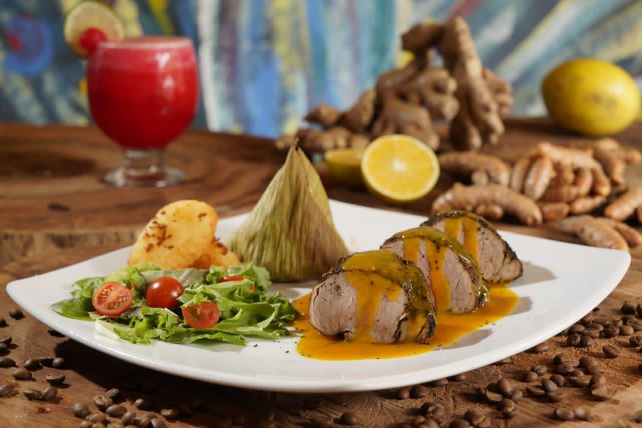 Venecia ya bautizó su plato típico: “La Montaña Sagrada”; solomito encostrado en café especial, puré de plátano maduro, jengibre y cúrcuma envuelto en hojas de “biao” o de plátano en forma piramidal, buñuelos de yuca y queso campesino, y verduras.