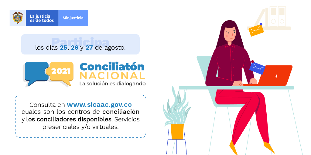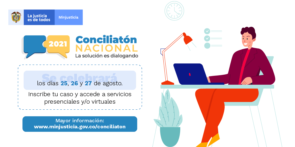 Desde Unilasallista Corporación Universitaria SEDE CALDAS ANTIOQUIA en conjunto con el GOBIERNO NACIONAL invitan a toda la comunidad del SUROESTE ANTIOQUEÑO para que participen y accedan a los servicios de la CONCILIATÓN 2021 en la cual podrás solucionar tus problemas de manera gratuita bien sea modalidad presencial o virtual a través de la conciliación.