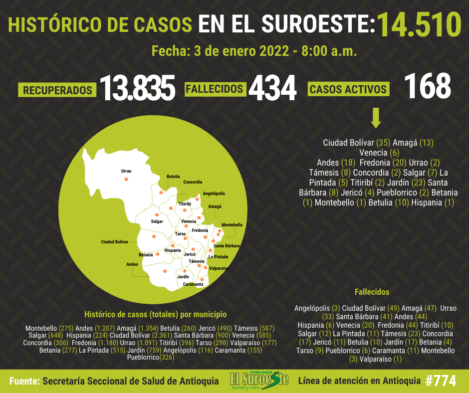 Según la Secretaría Seccional de Salud de Antioquia, el Suroeste antioqueño tiene actualmente 168 casos activos de COVID-19, el histórico de casos en la región asciende a 14.510 con una cifra de 13.835 recuperados y 434 fallecidos.