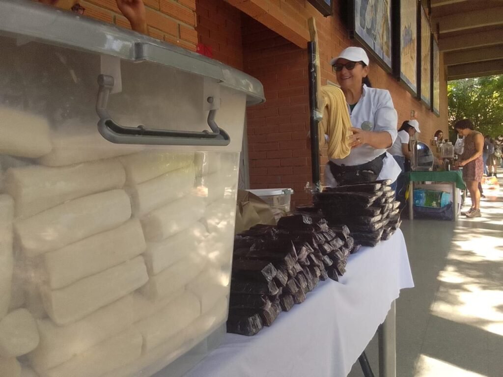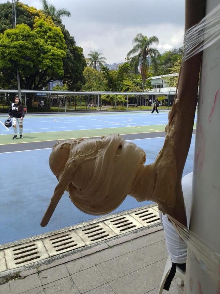 Yo estaba en el corredor de los mosaicos gigantes “Epopeya del café” de Longas (1943), entre la pared oriental del Teatro Camilo Torres y la arboleda al lado del Caballo al viento de David Manzur (2025) y más abajo la Cabeza de Barba Jacob (1983). —¿Y qué son esas fechas innecesarias? —Son memoria, yo veré. Se deja venir la entrevista, pare bolas, pues… Pone a cocinar las patas de res 14 a 16 horas en fuego lento en olla a presión, las deja reposar 4 horas, le retira el aceite o grasa, retira el hueso y la sustancia sanadora la lleva a licuado; posteriormente, en una olla honda vierte la sustancia sanadora con panela orgánica; Alba utiliza la panela de la finca de la mamá en Urrao, fuego otras 4 horas, deja reposar ya tirar en garabato. Si la quiere negra, agrega menos panela; la convierte así más simple y dura. ¿La quiere blanca? Ponga más panela y a darle pata en el garabato, una pizca de maicena y queda empolvada. “El garabato debe ser de madera de guayabo; otra madera se marea, entre más viejo, más fino”, dijo Alba Mery, mientras tiraba pata esa melaza oscura que va cogiendo un color nácar brillante, vueltas y vueltas dándole y dándole a la masa de cordones perlados dulces que vende en forma de bombones. Yo, dando las vueltas de compra y empacando gelatina de la negra, de la blanca. Hace 20 años que tira pata; en el garabato le enseñó una anciana, doña Nora, en Urrao. Hace 30 años damos pata en el gusano de lata metropolitano; hace más de 80 años empantanamos el río Medellín, rectificaron el cauce, lo hicieron servil a las patadas, sin meandros; el río les acaba los muros con el agua, el aguamierda, ciudad enferma. Metimos la pata en el atolladero y no sirve hasta ahora ningún político garabateo.