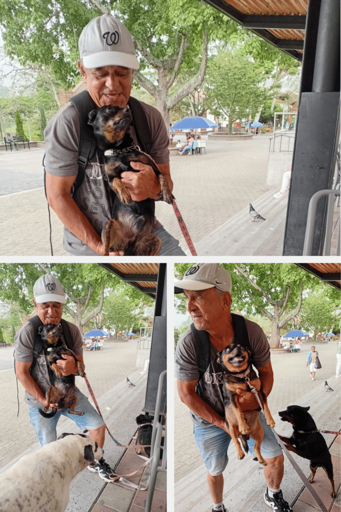 Él no sabe que lo estoy observando desde las mesas del atrio en Comfama; bajando con una mochila en su espalda y un soporte de bolsa de canguro adelante sobre el plexo solar. La mochila con Jordan adentro y el otro, Olkin, al frente, al mejor estilo marsupial; sus perros criollos, negros con café “negro y fuego”, simulan rottweilers miniatura. Compone una especie de armonía invisible entre humano y mascota. Mascota proviene de la palabra francesa mascotte, que significa amuleto o talismán; a su vez, deriva del occitano (hechizo o embrujo). Su origen tardío es “masca”, o sea, bruja en germánico o celta. Me parece entonces que Jaime está bajo el embrujo de sus perros, asimismo sus perros bajo el hechizo del lenguaje. Sí, los carga como un talismán. Ellos ladran, son recelosos con su dueño, alertan la compañía de un perro lacio de la mesa contigua, escandaloso; el bravucón provoca un intercambio de ladridos estentóreos de enemistad. Jaime pidió tinto y yo pedí aromática de manzanilla, miel y jengibre.