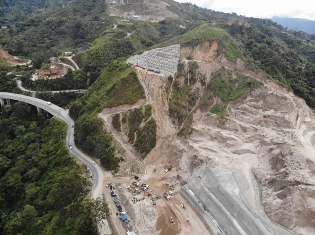 La intervención prevista para el Retorno 2 es una de las más complejas del corredor Pacífico 1. En un tramo inferior a un kilómetro, se requiere un corte profundo del talud derecho en sentido Amagá – Medellín, con una remoción cercana a los 600.000 metros cúbicos de material, taludes que superan los 110 metros de altura, 12 terrazas de estabilización, anclajes, concreto lanzado, drenajes y una configuración final que garantice la seguridad vial.