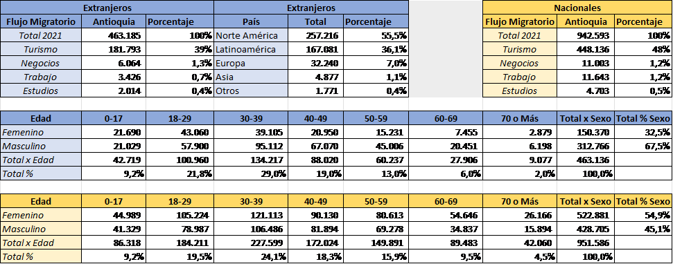 De los 463.185 pasajeros de nacionalidad extranjera que llegaron al departamento de Antioquia entre enero y noviembre de 2021, según Migración Colombia, al menos un 39% llegó con la intención expresa de hacer turismo regional. La mayoría provenientes de Norte América (55.5%) y Latinoamérica (36%), así como de Europa (7%) y Asia (1%). Entre los que se encuentra un grupo mayoritario, cuyo rango de edad oscila entre los 18 y 40 años y se distribuye entre hombres (33%) y mujeres (18%).