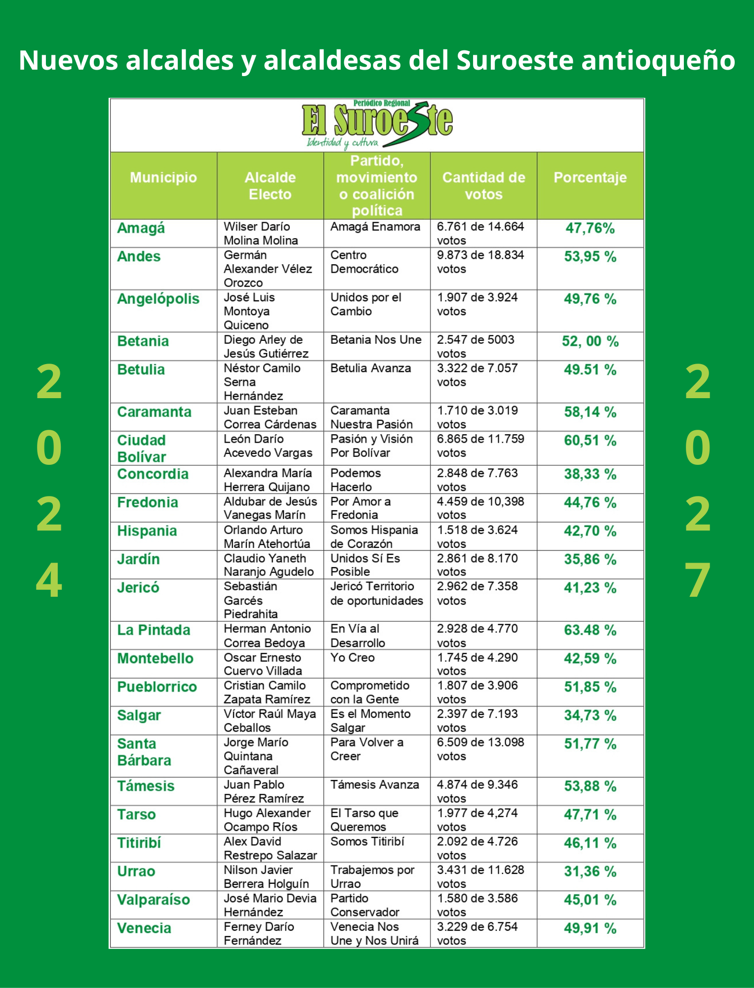 Tras la jornada electoral del domingo 29 de octubre fueron elegidos en el Suroeste antioqueño los 23 alcaldes que estarán en el gobierno durante el periodo 2024 – 2027.