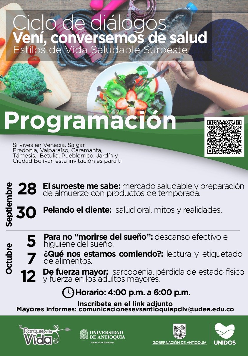Desde el 28 de septiembre hasta el 12 de octubre, se realizarán de manera virtual una serie de conversatorios sobre hábitos de vida saludable. La invitación es para dialogar junto a nutricionistas, educadores físicos, odontólogos, psicológicos y médicos, sobre alimentación saludable, ejercicio en casa, higiene del sueño, salud oral, salud mental y más temáticas para seguir cuidando de la salud.