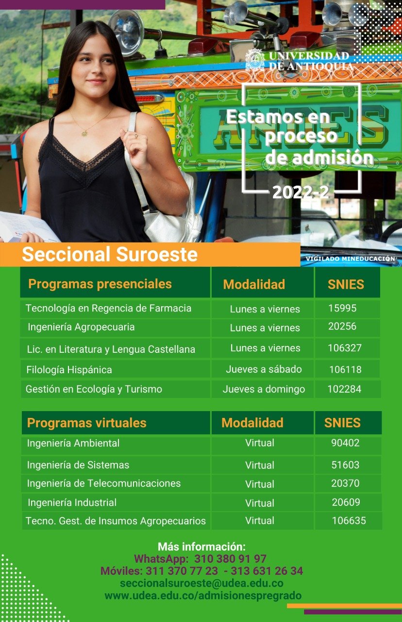 Inscripciones abiertas en la UdeA seccional Suroeste: la Universidad de Antioquia Seccional Suroeste tiene inscripciones abiertas para 10 programas, cinco presenciales y cinco virtuales.