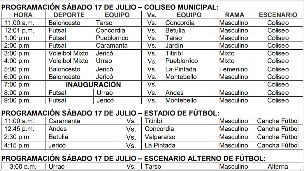 La fecha inaugural se realizará este sábado 17 de julio e incluirá 28 partidos en deportes colectivos, así: nueve de baloncesto, siete de fútbol de salón, cinco de fútbol y siete de voleibol mixto.