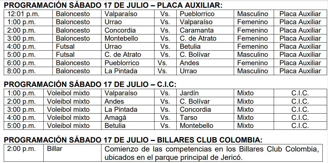 Los cuatro deportes de conjunto, además del billar, comenzarán el sábado 17. Las otras disciplinas individuales se harán entre el domingo 18 y el martes festivo 20 de julio. Los 10 deportes se llevarán a cabo por algunas de las vías de Jericó, el coliseo cubierto, la placa auxiliar, el estadio de fútbol, el Colegio San José, el CIC, el escenario multipropósito, el gimnasio y la piscina, la Casa del Deporte, el Parque Educativo y el billar Club Colombia.