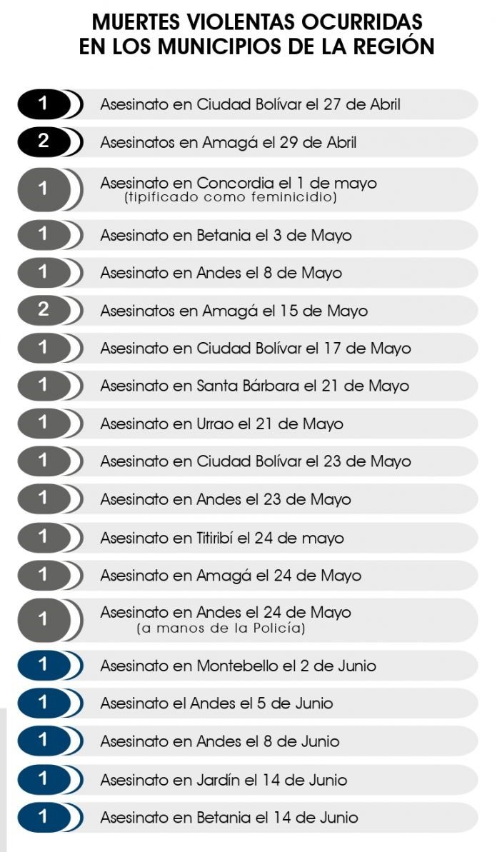 Andes, Ciudad Bolívar y Urrao son los tres municipios con mayor número de asesinatos en el Suroeste. Los hombres mayores de 18 años son las víctimas principales.