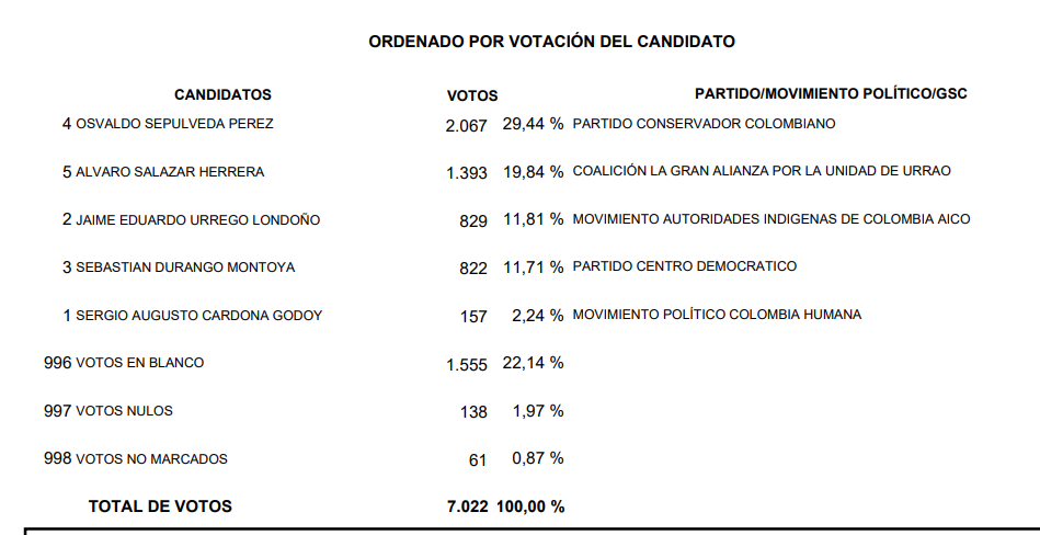 Con el 29,44 % de los votos (2.067), Oswaldo Sepúlveda Vélez del partido Conservador fue elegido como el nuevo alcalde del municipio de Urrao. La jornada electoral fue realizada el domingo 03 de abril, de 24.805 ciudadanos habilitados para votar, solo asistieron a las urnas 7.022 que representan 28,31 % del potencial de sufragantes.