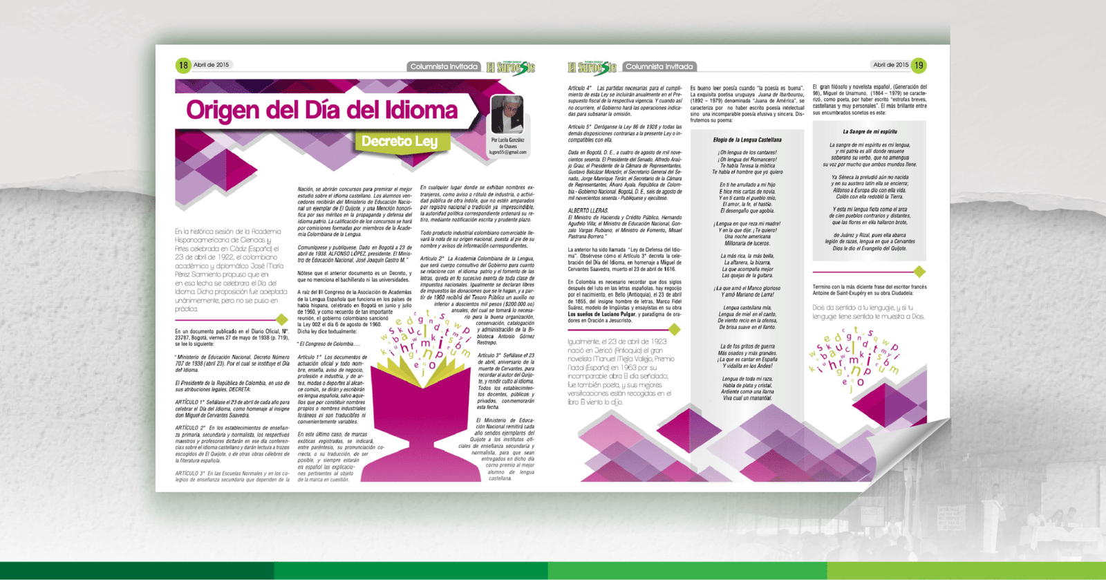En Colombia, la conmemoración se oficializó mediante el Decreto 707 de 1938, que estableció el 23 de abril como Día del Idioma en homenaje a Miguel de Cervantes Saavedra, autor de Don Quijote de la Mancha, considerado una de las obras más importantes de la literatura universal. La fecha coincide con el día de su muerte, en 1616.