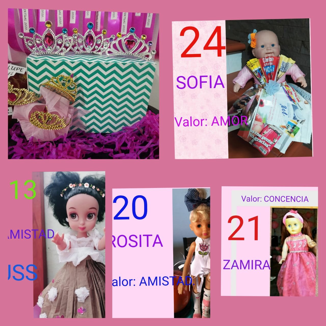 Siempre participan de 20 a 24 muñequitas y tenemos dos categorías; muñeca grande y muñeca pequeña. Y de ahí sale muñeca reina, virreina y princesa. Este año no pensábamos hacer el reinado por la pandemia, entonces varias niñas me llamaron y me dijeron que querían participar y me dieron la idea que lo hiciéramos virtual.