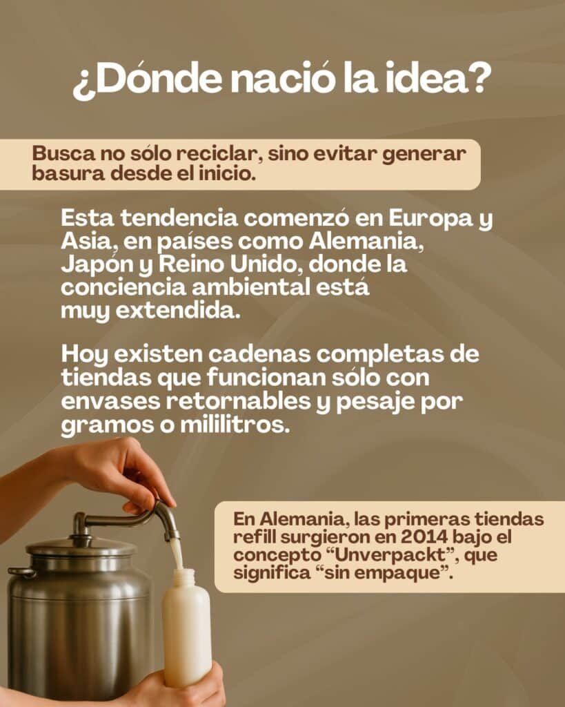 La tendencia del refill tiene sus raíces en países europeos que desde hace años vienen desarrollando políticas para reducir los residuos y promover estilos de vida sostenibles. En Europa, las primeras tiendas sin empaque nacieron del deseo de ofrecer una alternativa más ética al consumo convencional. Estos espacios, no sólo venden productos a granel, sino que también educan a las personas sobre el valor de reutilizar y reducir.