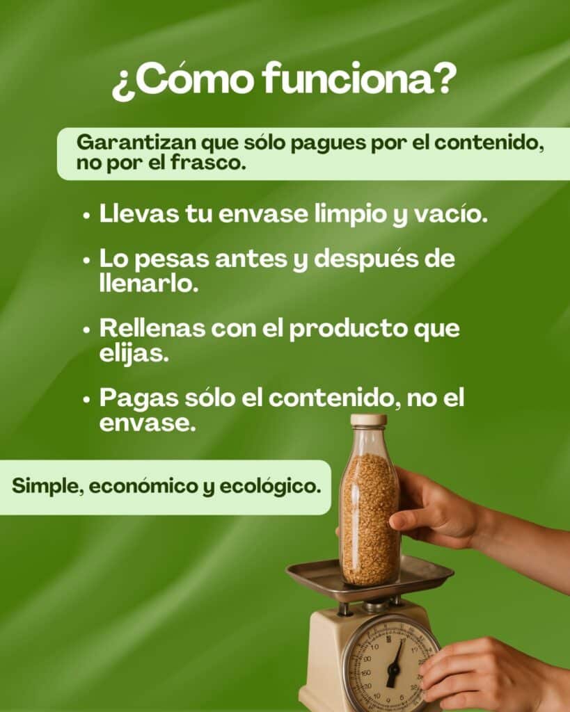 El sistema de las tiendas de refill es tan sencillo como efectivo. Las personas llevan sus envases limpios y vacíos, los pesan antes de llenarlos, y luego eligen el producto que desean comprar. Al finalizar, pagan únicamente por el contenido, no por el envase. Este modelo fomenta un consumo más responsable, ya que cada cliente decide la cantidad exacta que necesita, evitando el desperdicio y reduciendo la producción innecesaria de empaques.