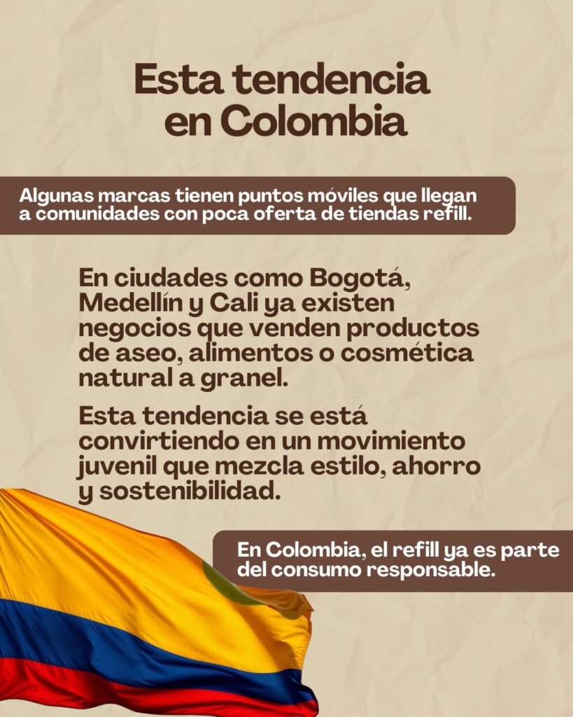 En Colombia, el movimiento refill ha comenzado a ganar espacio poco a poco, impulsado por el interés de jóvenes y emprendedores que buscan nuevas formas de cuidar el entorno. En ciudades como Bogotá, Medellín y Cali, ya se pueden encontrar tiendas y pequeños negocios que venden productos de aseo, cosmética natural o alimentos sin necesidad de empaques. Estos lugares, además de ofrecer una opción ecológica, se han convertido en puntos de encuentro donde las personas comparten ideas, intercambian consejos y descubren alternativas sostenibles para la vida diaria.