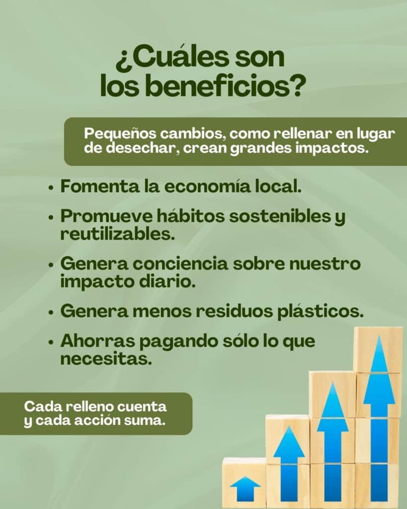 Adoptar el refill trae múltiples beneficios tanto para el ambiente como para la economía local. Al reutilizar los envases, se reduce considerablemente la cantidad de residuos plásticos que terminan en los vertederos y cuerpos de agua. También se impulsa la economía circular, donde los recursos se aprovechan al máximo y los desechos se convierten en oportunidades.