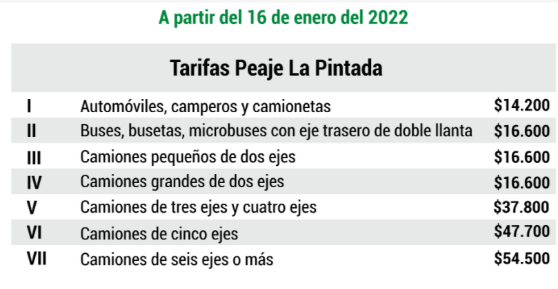 Beneficio otorgado por el Ministerio de Transporte a través de la Agencia Nacional de Infraestructura – ANI, con el cual los habitantes de los municipios del área de influencia del proyecto Conexión Pacífico 2 tendrán acceso a una tarifa diferencial en el peaje La Pintada, que corresponde al valor actual más el aumento del IPC (Índice del Precio del Consumidor) vigente para el año 2022.