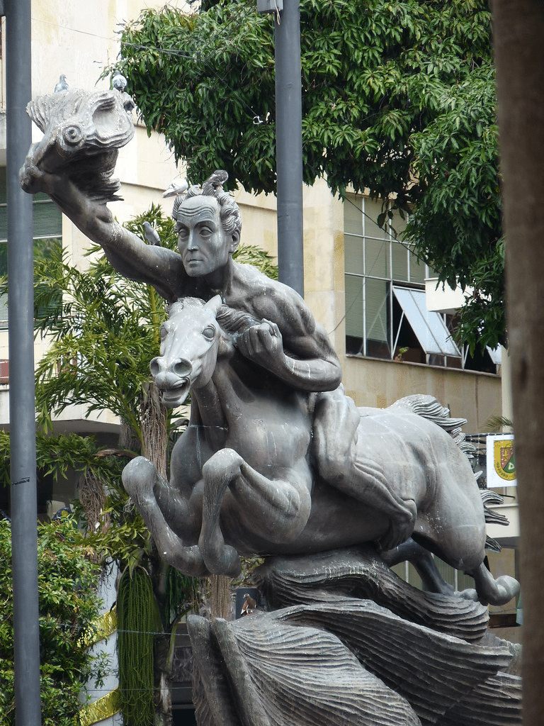 Esta es una escultura llena de movimiento de principio a fin, con un peso de 14 toneladas, fundida en bronce en el taller de Abraham González Holguín, en México, y transportada por vía marítima desde el puerto de Acapulco. En ella, Bolívar se convierte en una suerte de Prometeo: aquel que roba el fuego a los dioses para entregárselo a los humanos, haciendo posible su progreso y su civilización.