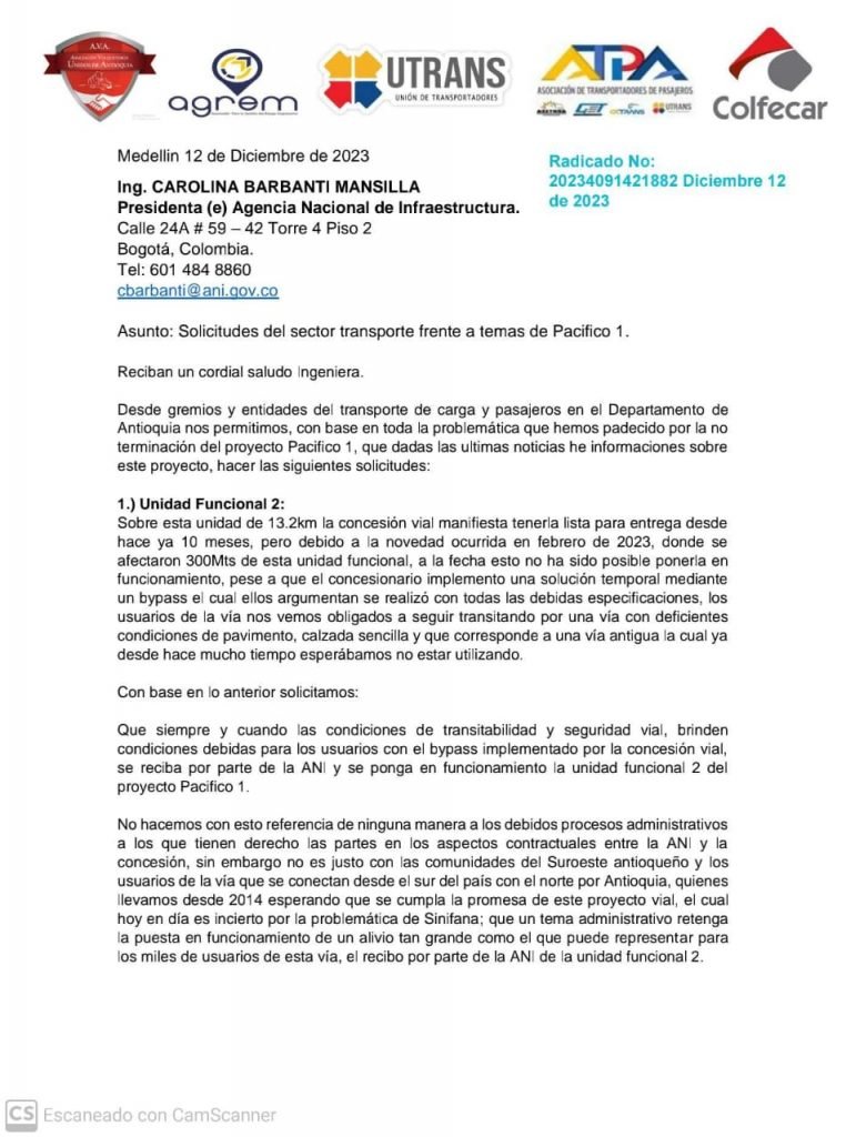 A través de una carta, la Asociación de Volqueteros Unidos de Antioquia, Colfecar Antioquia, Ultrans, ATPA y AGREM piden a la ANI que “Siempre y cuando las condiciones de transitabilidad y seguridad vial brinden condiciones debidas para los usuarios con el bypass implementado implementado por la concesión vial, se recibida por parte de la ANI y se ponga en funcionamiento la Unidad Funcional 2 del proyecto Pacífico 1”.